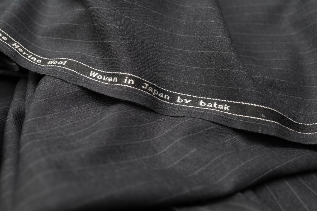 (2)batakの別注服地です。控え目なストライプ柄のダークグレイ。シワになりにくく、耐久性に優れた品質。コスト・パー バリューを満足させるお品です。生産はメイド・イン・ジャパン。オススメは、ダブルブレステッドのスーツ、シングルの3ピースなど。3シーズン対応のウエイト300g。