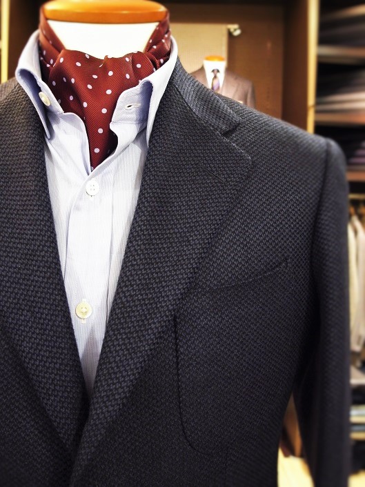 テイラーで洋服を仕立てる場合、店頭に服地(1着分以上)を用意しているケースが通常ですが、店頭にあまた並んでいるバンチブック(見本帖)を見比べながら注文服地を決定するケースも増えて来ています。バンチブックを使うと非常に多彩な服地見本から選べるので効率的ですし。服地選びの満足感も同時に得られる点が魅力です。一方、着分にカットされた服地を使うと、仕立て上がりのイメージがつかみやすいという安心感があると同時に、服地メーカーではもう作ってはいないレアな服地を探すことができます。どちらがいいかはお客様次第ですが、通(つう)になると店頭在庫の出物情報に耳をかたむけている方が少なくありません。たとえば、「ラムズ・ゴールデン ベイル」の毛糸で織った珍しいコート専用服地。織り元は「テイラー&ロッジ」。終売品ですので、お品はこれ1着分だけ。シャドーヘリンボーンの単色。仕様は申し分ありません。希少で貴重。そんな服地が店頭には定期的に入荷します。いまこの瞬間にもキープが入っている可能性があるかもしれませんので、店頭までお問い合わせを。