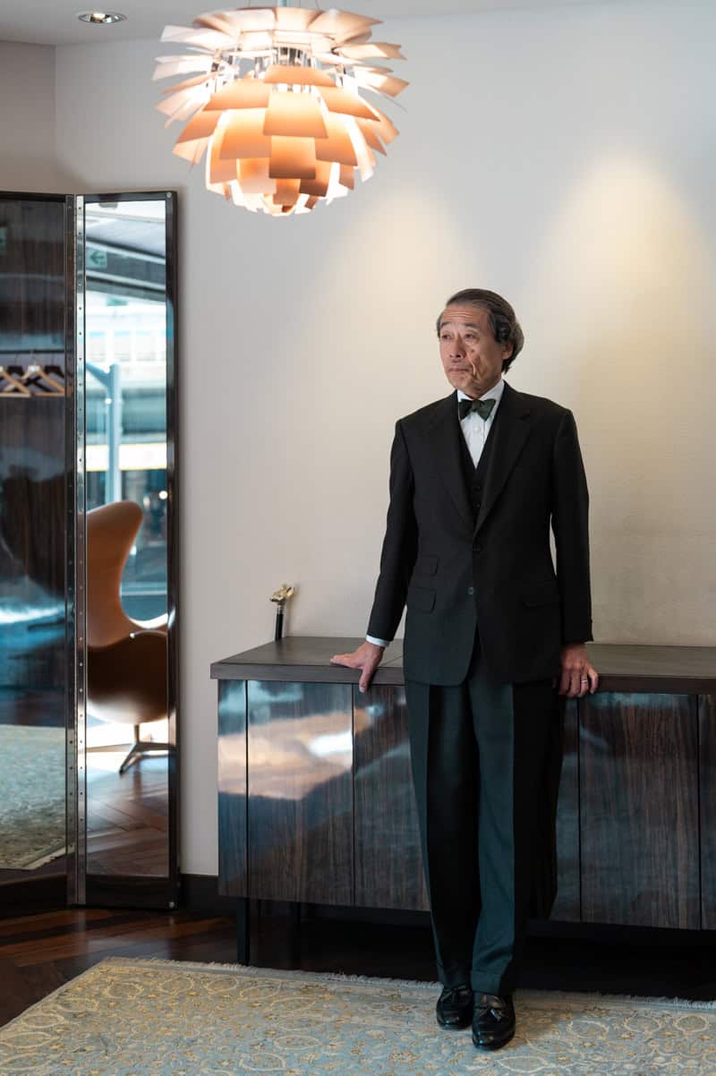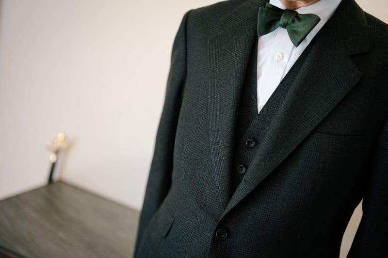 生地のことに関しては誰よりも造詣が深い長谷川が一目惚れをした生地があると言います。人に恋するのが理屈ではないように、出会った瞬間に「これで作ろう」と一目惚れした生地が『カイノック』ヘリテージツイストです。そんな長谷川にあえてこの生地の魅力を聞いたところ、100年以上前の織り方(成分も含めて)を忠実に再現した稀有な生地とのこと。そして、当時は他人と違うものを誂えるのが主流だったことに想いを巡らせている様子でした。「どう着ようかな?」とワクワクしながらコーディネイトを考える長谷川を見て、注文服の魅力を再認識した次第です。さて、そんな一目惚れした生地で誂えたスーツがついに完成したようです。果たしてその着こなしは...