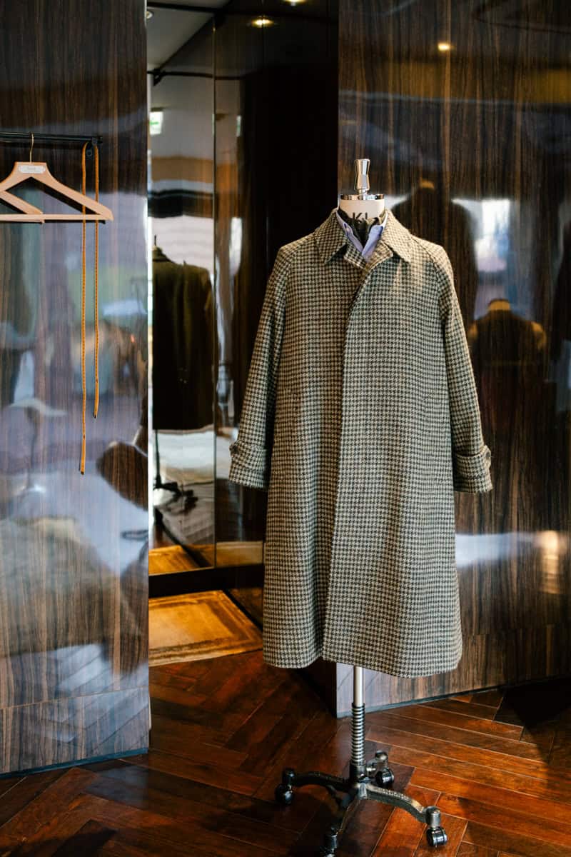 バタクでは創業時よりヴィンテージ生地に着目し、独自の視点で良いと思った生地を取り扱ってきました。限りあるヴィンテージゆえに、良いものを入手することが年々難しくなっているのは事実ですが、時折「これは!」と思わせてくれる出物との出会いがあります。今回ご紹介するハリスツイードもそのひとつです。あまり知られていませんが、良質なヴィンテージのツイードが出てくることは滅多にありません。このハリスツイードはスコットランドの思わぬ場所に眠っていたところを縁あって入手できた次第です。まず目を引くのはガンクラブチェックの色柄。間近で見ると多くの色糸が使われています。粗さの中に趣を感じる出色のツイードです。「このツイードならクラシックラグランコートでしょう!」と即断即決でご注文をいただいた仕上がりをご覧ください。古き良き時代の薫がする唯一無二のクラシックラグランコートです。