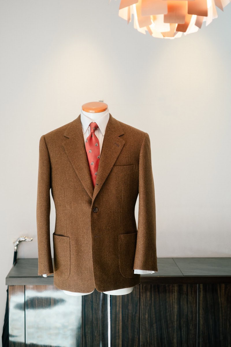 50歳を機に、キャリア・ライフスタイル・人間関係・趣味などを見直し、これからの人生をより豊かなものにするために前向きな行動を起こす時期と捉える人が多いと言います。バタクのお客様も同じように、50歳を節目と捉えて新しい扉を開ける方が多いように思います。50を過ぎて見えてきた着飾ることの愉しみ、そのひとつは等身大の装いです。これまでの経験を活かしつつ自然体に見える装い。それ以上でもそれ以下でもありません。しかし、着る人の経験値に基づく味わい深さはこの上なく魅力的に映るものです。ご紹介するお仕立て上がりは、50を過ぎて初めてツイードでご注文をいただいたお客様のジャケットです。機が熟すタイミングを待ってのご注文でした。実はブラウン系のお色も初めてでしたが、飾り立てない自然体の装いに膝を打つほどでした。