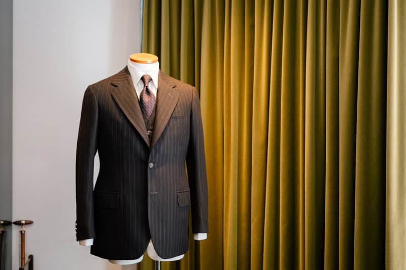 ヴィンテージのモクソンの生地で仕立てたスーツをご紹介します。この手のクラシック嗜好が強い生地の場合、お客様とテーラーの関係性が重要になってきます。着用感、フォルム、仕様、縫製などはもちろんのこと、お客様のキャラクターをしっかり理解していないと双方にとって良いスーツは生まれません。こちらのお客様とはバタク創業以来のお付き合いになります。これまで数えきれないほどの対話を重ねて信頼関係を築いてきました。シニアにさしかかるお客様の個性や雰囲気を魅力的に表現するには、確かな審美眼と美意識が必要となります。そして、それを具現化するのがビスポークによる縫いの技術なのです。お客様の魅力でもある柔和な雰囲気をスーツに反映することができたと自負しております。